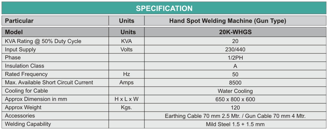 WELSON” Hand spot welding machine are offered in 20 KVA model. This machine is highly flexible which is suitable for larger or smaller operation with its compact design. It has automotive applications and quick precision welding with durable joints and easily transported cable and gun.